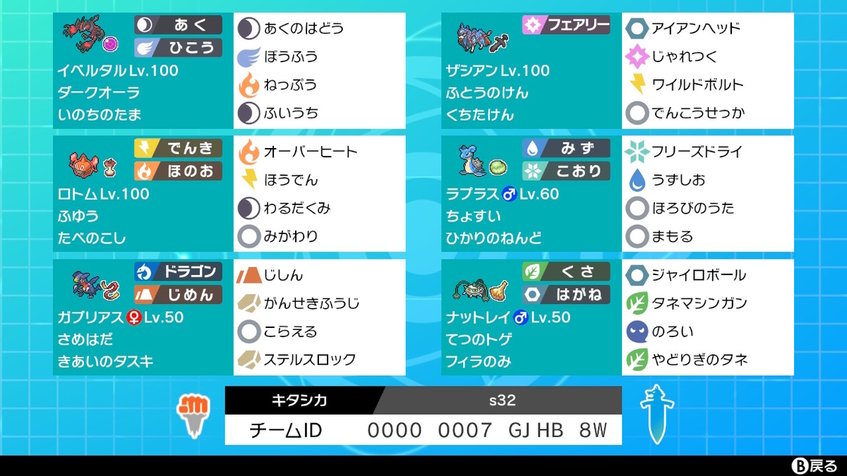 地震+鮫肌×2でだいたい落ちるので、ザシアンに対して1-1交換以上を取れます。引かれたら、ザシアンが対面に残らずに裏からイベルタルやラプラスが投げられます。